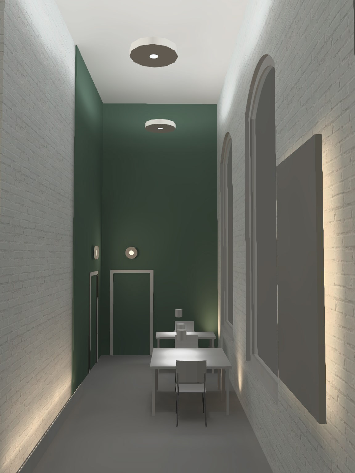 Tidigt i processen kom jag fram till att det behövs en ljusare färg på väggen och hyllplanet vid receptionsluckan. En för mörk bakgrund gör att en lysande armatur riskerar att blända. En ljusare yta hjälper dessutom till att sprida ljuset, vilket gör att armaturen i sig själv inte behöver lysa lika starkt.